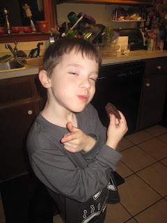 Chris and Hunter kept asking to try some cake. So, when I shaved off the tops of the cake everyone got to try some. Hunter being silly, again...